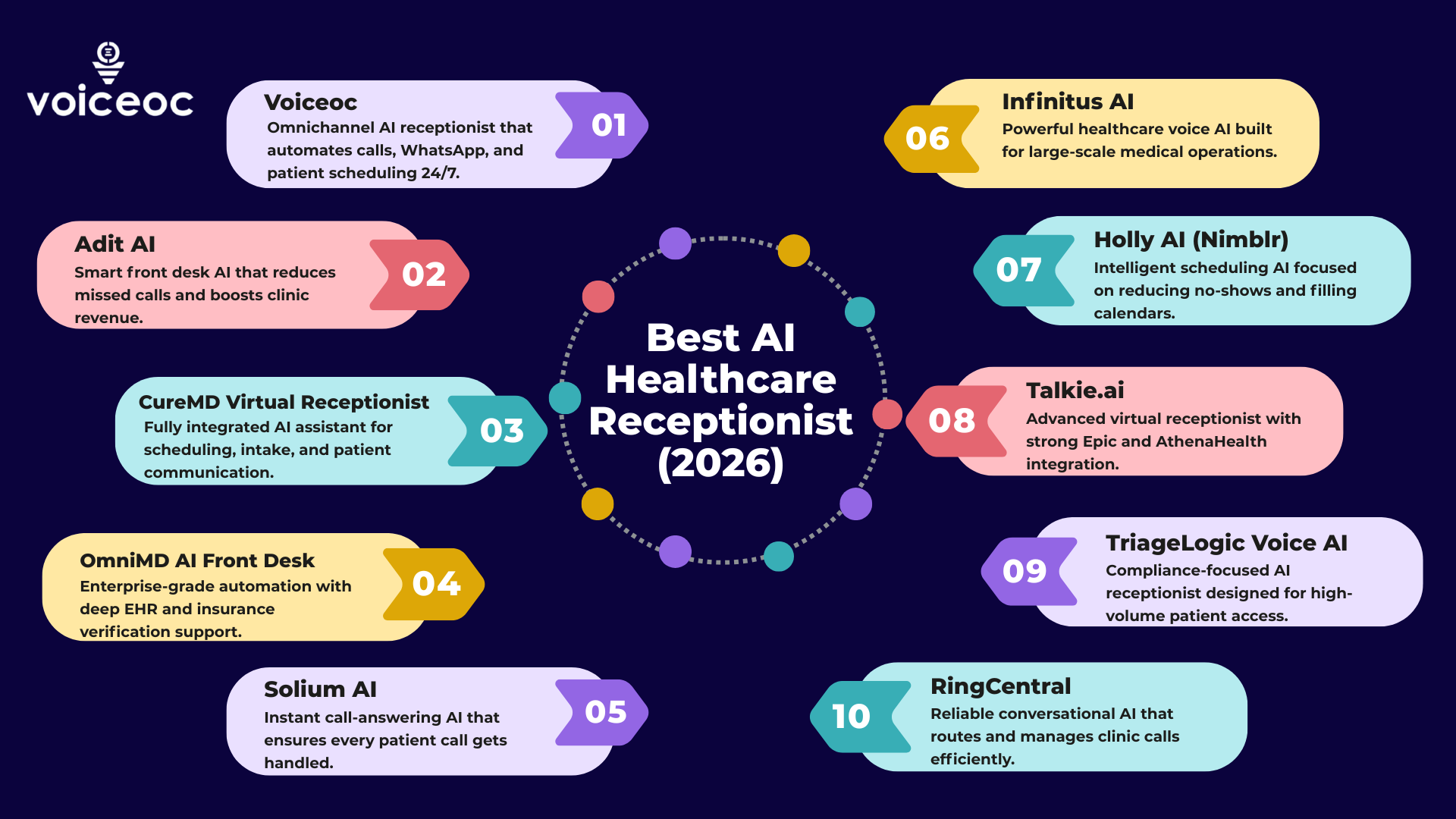 This guide will give you a highlighted list of top AI healthcare receptionists that shape clinic and hospital operations in 2026 with proper automation, billing accuracy, and patient-centric insights.